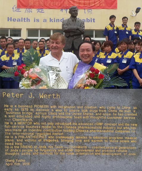 In recognition of his accomplishments, Jinan Jinda bestowed on ChemWerth’s founder a public dedication, a statue in his likeness and a plaque highlighting his achievements and contributions to Jinda’s and China’s success in the industry. Congratulations Peter on the much deserved recognition!